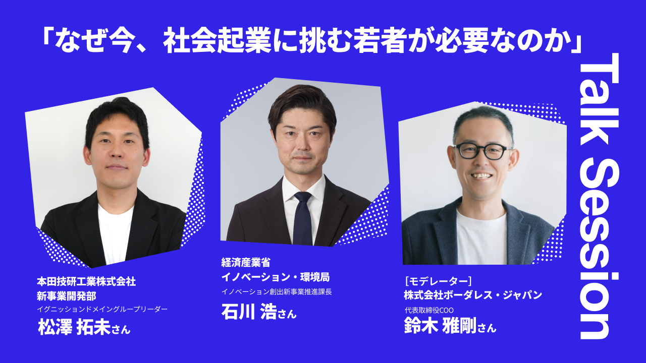 その後、開催されたトークセッションには、本田技研工業株式会社新事業開発部イグニッションドメイングループリーダー松澤拓未氏や経済産業省イノベーション・環境局イノベーション創出新事業推進課長石川浩氏が登壇。トークセッションでは「なぜ今、社会起業に挑む若者が必要なのか」をテーマに、若手起業家育成の視点から、ソーシャルビジネスの可能性や挑戦を支える環境づくりの重要性についてお話しいただきました。